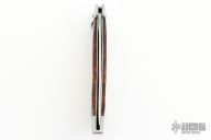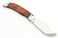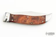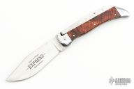 This Express Auto by Schatt and Morgan features a satin finished blade. The handle has stainless steel bolsters, Amboyna burl scales, stainless steel liners, stainless steel spring. Push the lever to fire and close the knife. Has a few light scratches, otherwise excellent condition.