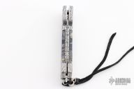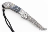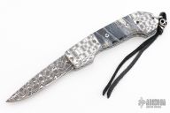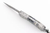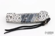 This Mike "Whiskers" Allen Scale Release Auto has a Damascus drop point blade with fileworked spine. The handle has double Damascus dovetailed bolsters, fileworked stainless steel liners, mammoth scales, fileworked stainless steel backspacer, lanyard bail at the butt. Beautiful piece. Excellent condition.