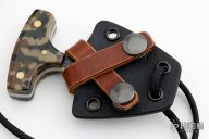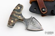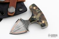 This knife by Lion's Den Blades features a "Dion" San Mai Damascus double edge blade with .156" blade stock and 1.423" blade depth, full tang construction with camo resin scales and brass pins. Comes with a kydex sheath with leather keepers. Has some light scratches, otherwise excellent condition.