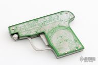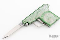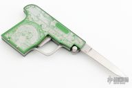 This special automatic knife is a remake of the old Maniago gun-letter opener made on 50's. The handle is made of aluminum and the blade of 440C steel. This knife is not for EDC use, but for collectors who like a piece of Italian knife history or like a letter opener. The artwork is by JB. Excellent condition.