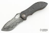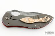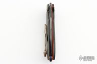 This Mini Skirmish by Neil Blackwood features a recurve blade with hamon notched thumbrest and thumbhole. The handle has a marble carbon fiber front scale with an orange and red G-10 liner, bead blasted titanium lockside, 3-piece copper and anodized titanium backspacer, and a tip up mokume clip and pivot collar. Nice detent, lockup and blade seating. Comes with a zippered case. Excellent condition.