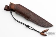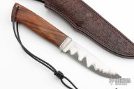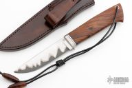 This custom hunter by Pavel Murnikov features a hand rub satin finished drop point blade made from San Mai Damacus with K110 steel core and 440C cladding, notched thumbrest, .121" blade stock and 1.120" blade depth, hidden tang construction. The handle has a satin finished titanium guard and an ironwood grip with mosaic lanyard pin. Comes with a hand tooled brown leather sheath, original box and COA. New from maker.