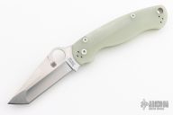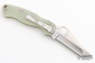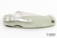 This Paramilitary 2 by Spyderco features a satin finished tanto blade with thumbhole, notched thumb ramp and choil. The handle has a textured jade G10 scales over a stainless steel subframe and lockbar. 4 way adjustable pocket clip and lanyard tube in pommel.  Excellent condition.
