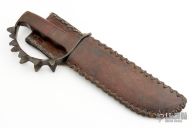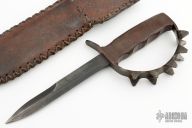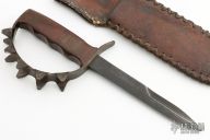 This Trench Knuckle Knife features a black M3 bayonet blade, .194" blade stock and .851" blade depth, hidden tang construction. The handle has a stacked leather grip and a crenulated steel D-guard knuckle protector. Comes with a hand tooled brown leather sheath with "WRS". Has some normal wear and patina, otherwise good condition. Theatre made