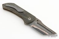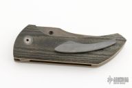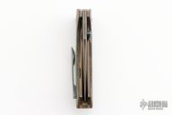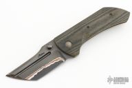 This SpitFire by Fernando Medina features a Dion Dammy CuMai San Mai Damascus blade with 52100 core, single zirconium thumbstud and a false top edge. The handle has black canvas micarta scales, anodized titanium liners, zirconium tip up clip with hidden screws, black canvas micarta backspacer and carbon fiber pivot collars. Rides on bearing, nice detent, lockup and blade seating. Comes with a velcro case and COA dated 5/18/20. Has a couple light scuffs, otherwise excellent condition.