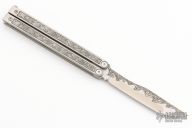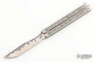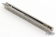 The Michael Zieba Balisong is a custom butterfly knife available at a production price point. It features his trademark harpoon drop point spine profile with a tanto cutting edge so that it will fit into the slender frame. The blade has a laser engraved San Mai pattern. The titanium handles bead blast finished with laser engraving and silver skull spacers. The bearing pivots lead to very smooth flipping action and its proper balance allows you to perform any trick you're daring enough to try. This butterfly knife is a fantastic representation of Mike as both a designer and a knifemaker. It's precise, stylish, different from the rest, and is both new age and classic. Handmade in the USA. Comes with a zippered case and maker's card. Excellent condition.