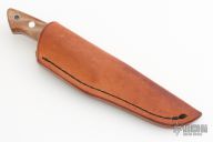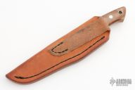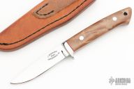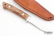 This Loveless Style Slim Hunter by James Sponaugle features a mirror polished blade with .122" blade depth and .778" blade depth, full tapered tang construction. The handle has maple scales, stainless steel guard and red liners/spacers. Comes with a brown leather sheath and a zippered case. Excellent condition.