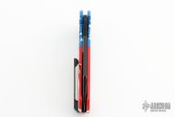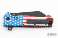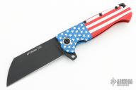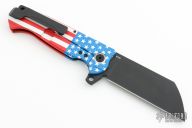 This ADV Butcher framelock flipper has a black finished blade and notched thumbrest and flipper. Handle has American Flag theme titanium frame, black finished titanium back spacer and tip up clip. Nice smooth action, detent, lockup and blade seating. Comes with zippered case. Excellent condition.