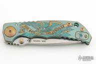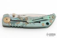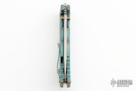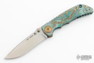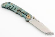 This Harsey framelock folder by Spartan Blades features a stonewashed drop point blade with dual thumbstuds and a notched thumbrest. The handle has an anodized titanium frame with laser engraving, a tip up titanium clip and filler tab. Has nice detent, lockup, and blade seating. S45VN. Excellent condition.