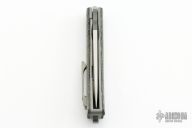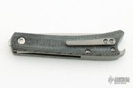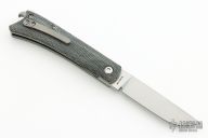 This knife features a satin finished drop point blade with a single nail nick and a notched thumbrest/flipper tab.  The handle features micarta scales over bead blasted titanium frame with a matching backspacer and bottle opener.   Bead blasted titanium bottle escutcheon and a matching tip up pocket clip.  Includes a padded zippered case.  New from Maker!