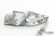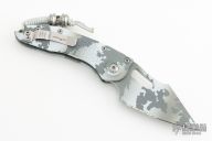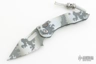 This Stitch Auto by Microtech Knives features an arctic camo finished partially serrated blade and false top edge, notched thumb and finger rests. The handle has an arctic camo milled aluminum handle with a bronzed titanium backspacer and a stainless steel clip, tip up carry, lanyard hole at the butt.Dated 04/2023. Includes the original box and papers.  Excellent condition.