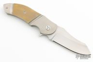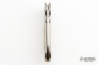 This N° 185 linerlock flipper by Sergio Consoli features a hand-rubbed satin finish blade with notched flipper. The handle has satin finished and partially anodized titanium scales, Inox steel liners, and an anodized titanium backspacer. Sergio's ball bearing system gives the knife an effortless flip that requires no wrist action. Nice lockup, detent and blade seating. Outstanding work. Comes with leather belt sheath. Has a couple light scuffs, otherwise excellent condition