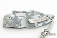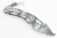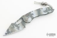 This Stitch Auto by Microtech Knives features an artic camo finished fully serrated blade and false top edge, notched thumb and finger rests. The handle has an artic camo milled aluminum handle with a bronzed titanium backspacer and a stainless steel clip, tip up carry, lanyard hole at the butt.Dated 04/2023. Includes the original box and papers.  Excellent condition.