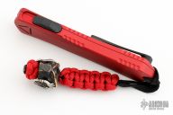 This Manticore-E by Heretic Knives features a two-tone DLC tanto blade with notched thumbrest. The handle has a red aluminum frame, black stainless steel hardware and tip down clip, and a g10 thumbslide. Comes with original box and papers. Comes with a Predator bead. Has some light scuffs, otherwise condition.