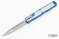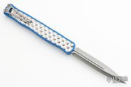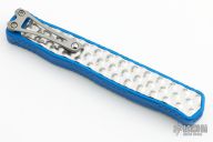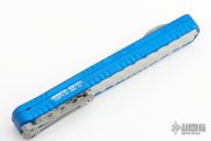 This Cleric II OTF by Heretic Knives features a stonewash double edged Magnacut blade. The handle has a blue aluminum frame with silver bubble inlays, bead blast titanium tip down clip, left or right reversible. S/N 00883. Comes with original box and lube. Excellent condition.