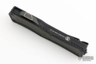 This Colossus by Heretic Knives features a hand ground Baker Forge Damascus blade with notched thumbrest. The handle has a black aluminum frame with Black Dunes Fat Carbon inlays, DLC stainless steel thumb slide with Black Dunes Fat Carbon inlay, stainless steel tip down clip. Comes with original box, zippered case and COA dated 5/22 and s/n 021. Excellent condition.