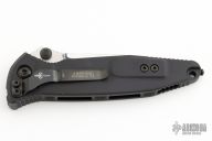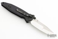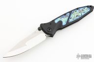 This Socom Elite by Marfione Custom Knives features a compound ground blade with mirror polished grinds and satin finished flats, DLC coated dual thumbstuds, M390 blade steel, notched thumbrest. The handle has a black aluminum frame with Abalone inlays, DLC coated hardware and tip down stainless steel clip. Comes with original box, zippered case and COA. Dated 10/2018 and s/n 007. Excellent Condition.