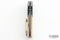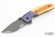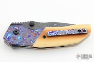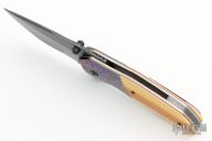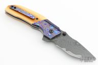 This Full Dress Hardline 3 linerlock by Chad Nell has Armor Core Boomarang San-Mai Damascus clip point recurve blade with notched thumbrest and dual thumbstuds. The handle has Westinghouse micarta scales, Kraken Black Timascus bolsters and tip up clip. Orange peel finished titanium liners, red liners, Zirconium backspacer. Ceramic bearings. Nice detent, lockup and blade seating. Comes with nylon zippered case and COA dated 4/19. Excellent condition.