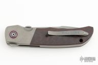 This Eagle Rock linerlock is from Custom Knife Factory and designed by Bob Terzuola. It features a tumble finish multi-ground blade with fullers and false top edge, notched thumbrest and a thumbdisc. The handle has Timascus pivot collars, stonewash bolsters, carbon fiber scales, stonewash titanium liners, stonewash backspacer, tip up titanium clip. Nice blade seating, detent, and lockup. Excellent work. Comes with original Velcro case and COA. Excellent condition.