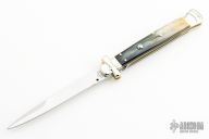This lockback Auto by AGA Campolin has a mirror polished stainless steel spear point blade with false top edge. The handle has buffalo horn scales with mirror polished nickel silver bolsters, brass liners, stainless steel backspacer. Includes the original box and a brown leather slip sheath.  This knife has been professionally tuned and polished by Greg's Effects.  Excellent Condition.
