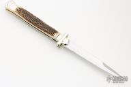 This lockback Auto by AGA Campolin has a mirror polished stainless steel spear point blade with false top edge. The handle has stag scales with mirror polished nickel silver bolsters, brass liners, stainless steel backspacer. Includes the original box and a brown leather slip sheath.  This knife has been professionally tuned and polished by Greg's Effects.  Excellent Condition.
