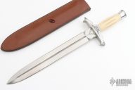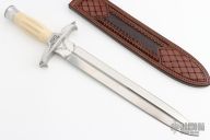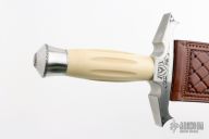 This Dagger by Gerry Jean features a hand rub satin finished double edged blade with fullers, has engraved ricasso, .258" blade stock and 1.504" blade depth, hidden tang construction. The handle has an engraved stainless steel guard and butt with a fluted ivory paper micarta grip. Comes with a hand tooled brown leather sheath with black snake skin inlay by the legendary Paul Long. Has a few light scratches, otherwise excellent condition. Stamped "GJ 308" under the ricasso, it is also stamped "L" on the ricasso. Comes with a Maxpedition zippered case.