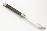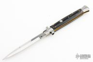 This 11" Picklock by Frank Beltrame features a mirror polished bayonet ground blade with false top edge. The handle has steel bolsters, front and rear, buffalo horn scales, brass liners and stainless steel spring. Includes a slip sheath.  This knife has been professionally tuned and polished by Greg's Effects.  Excellent Condition.