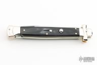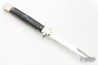 This lockback Auto by AGA Campolin has a mirror polished stainless steel spear point blade with false top edge. The handle has Buffalo horn scales with mirror polished nickel silver bolsters, brass liners, stainless steel backspacer. Includes the original box and a brown leather slip sheath.  This knife has been professionally tuned and polished by Greg's Effects.  Excellent Condition.