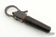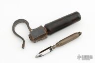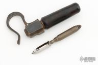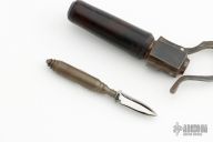 This hidden spike knife by Hidetoshi Nakayama features a polished chisel ground blade with turned and textured handle. The knife/spike fits in a metal and wooden scabbard with latch on top and can be used as a keychain or a necklace. Very cool piece. Totally handmade. Excellent condition.