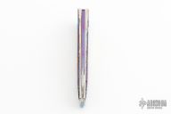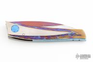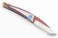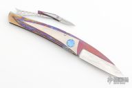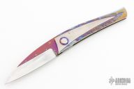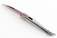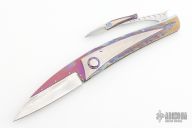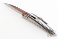 This knife by Jean Pierre Sucheras features a Damascus blade with anodized titanium spine attached by 4 screws. The handle has a milled and anodized titanium frame with textured and anodized titanium backspacer. Nice smooth action, lockup and blade seating. Comes with a textured titanium piece that goes into the backspacer and a miniature slipjoint version of the knife rests on top. The small knife does also fold and is a slipjoint. Comes with a COA and zippered case. Excellent condition.