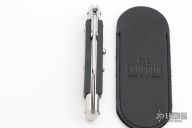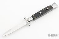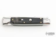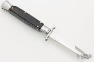 This Swing Guard Lockback Auto by AKC Italy has a polished stainless steel spear point blade with false top edge. The handle has buffalo horn scales with stainless steel bolsters, brass liners, and stainless steel back spacer and lock.  This knife has been professionally tuned and polished by Greg's Effects.  Includes the original box and sheath.  Excellent Condition.