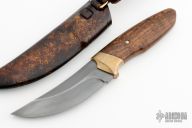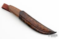 "I make mostly daggers, fighters and what I call “Kwaikens” but also swords and folding knives. I primarily use 1050 carbon spring steel and damascus of various compositions and on occasion, stainless steel for the blades. For the 1050 I employ a clay “tempering” technique that gives the blade a beautiful temper line (hamon) as well as a hard edge while maintaining a flexible core of the blade. These blades are rough ground and then finished off by hand with files and sandpaper before the final stage of etching the blade to bring out the hamon. When it comes to damascus, I tend to lean towards a simpler random or a twist pattern that goes with the overall simplistic scheme of my knives. These blades are worked and finished in a similar fashion as the carbon steel ones. I use stainless steel, mostly Damasteel stainless damascus, for folders, art knives ( for ex. Skull Cleaver and Druid Sickle) and some full-tang dress-knives, my Tuxer model, or upscale hunting/skinning-knives. For the handles and wooden sheaths I use rare exotic hardwoods, ancient ivories and bone material from all over the world. Even large pieces of natural amber has found its way onto a couple of my knives. A few wood favorites are Snakewood for its amazing striped grain pattern, Masur birch, Eucalyptus , and Redwood burl for its sometimes silky appearance."
