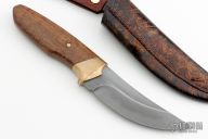 This Kwaiken by Anders Hogstrom features a 1050 steel blade with beautiful hamon, .234" blade stock and 1.404" blade depth, hidden tang construction. The handle has a textured bronze guard, beautiful ironwood grip. Comes with a hand tooled leather sheath and a velcro case. New from maker.
