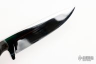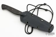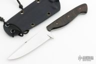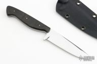 This Hunter from Citadel Knives features a mirror polished drop point blade with .145" blade depth and 1.006" blade depth, full tapered tang construction. The handle has black linen micarta scales. Includes a kydex neck sheath and padded/zippered case. Has a couple light scratches, otherwise excellent condition.