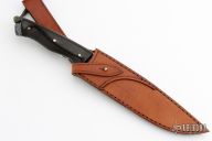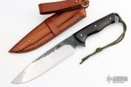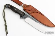 This Camp Knife from Citadel Knives features a mirror polished with forge finished flats, .223" blade depth and 1.728" blade depth, full tapered tang construction. The handle has black linen micarta scales. Includes a brown leather sheath. Has a couple light scratches, otherwise excellent condition.