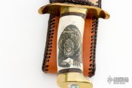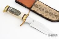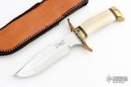 This Bowie Knife by J Nowill & Sons features a polished blade with .369" blade stock and 1.559" blade depth, hidden tang construction. The hand has a fileworked brass guard and butt with abalone inlay, scrimshawed stag grip with wood spacers. Scrimshaw done by "F.M.". Comes with a brown leather sheath with snakeskin overlay. Has some light scratches and some light pitting on the blade, small nick in the blade edge, otherwise good condition for its age.
