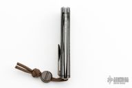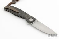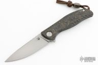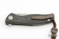 This F3 Flipper from Shirogorov has a tumbled flat ground spear point blade with notched flipper. Handle has carbon fiber scales, tumbled titanium backspacer, tip up clip and liners. Recessed lanyard bail. Dead center blade seating, excellent detent and lockup. Rides on bearings. Excellent condition.
