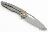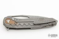 This Sigil MK6 by Microtech Knives features an Apocalyptic finished blade with thumb hole and flipper, notched thumbrest. The handle has an Apocalyptic finished titanium frame, tip up clip and backspacer with a distressed copper overtravel stop, stainless lockface insert. Comes with original box and papers. S/N00248, 12/2016. Excellent Condition.