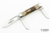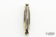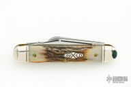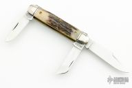 This slipjoint from Great Eastern Cutlery features three polished blades with nail nicks. The handle has nickel silver bolsters and burnt stag covers with nickel silver escutcheon, brass liners and steel backsprings. Includes original packaging. Has a few light scratches, otherwise excellent condition.