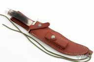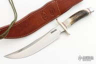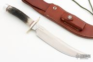 The RKS4 is the fourth club knife made by Randall Knives for the Randall Knife Society. The blade is etched "RKS 1151/061". Carbon steel blade with sharpened top edge, .208" blade stock and 1.402" blade depth, hidden tang construction. The handle has nickel silver guard, stag handle with red, white and blue spacers, and a duralumin butt. Comes with a brown leather sheath and Randall zippered case. Excellent condition.