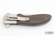 This Cobra linerlock flipper by the Late Phil Boguszewski features a hand rub satin finished blade with notched flipper. The handle has orange peel, finished titanium bolsters, green canvas micarta scales, titanium liners with jeweled interiors, titanium tip down clip, black linen micarta backspacer. Smooth action, nice lockup, detent, and blade seating. Excellent fit and finish. Numbered 65 on the blade. Includes padded case. This rare piece is in excellent condition and shows no signs of use or carry. Excellent Condition.
