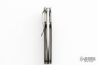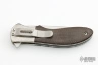 This Mini Cobra linerlock flipper by the Late Phil Boguszewski features a hand rub satin finished blade with notched flipper. The handle has orange peel finished titanium bolsters, green canvas micarta scales, titanium liners with jeweled interiors, titanium tip down clip, black linen micarta backspacer. Smooth action, nice lockup, detent, and blade seating. Excellent fit and finish. Numbered 27 on the blade. Includes nylon belt sheath. This rare piece is in excellent condition and shows no signs of use or carry. Excellent Condition.