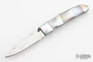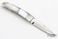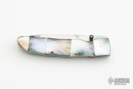 This Me-Dake by Koji Hara features a mirror polished San Mai Damascus blade and a black lip pearl inlaid thumbstud. The handle has black lip pearl with nickel silver spacers/liners, it is sculpted to have the contours of a piece of bamboo. The blade has bamboo leaf carvings and the blade spine is also sculpted to give the piece a bamboo feel from the tip of the blade to the end of the handle. Beautiful work. Great blade seating, detent and lock up. Comes with cloth pouch and makers card. New from maker at the 2023 Blade Show.