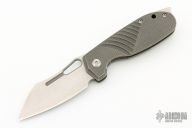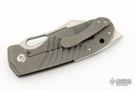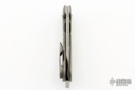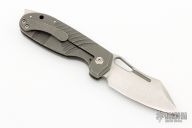 This H.S. Possum by Jason Stout and Jeremy Horton features a chisel ground stonewashed blade with a fuller and thumbhole. The handle has a  tumble finished titanium frame with matching tip up pocket clip and a D2 steel backspacer. Nice detent, lockup and blade seating. Comes with a zippered case and a COA dated Blade Show 2022.  Excellent Condition.