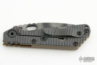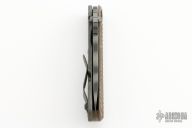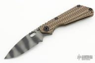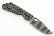This Mick Strider SNG framelock folder features a tiger striped blade with thumbhole and notched thumbrest. The handle has a "TigerTrack" G-10 and flamed titanium frame with titanium clip, tip up carry. Jimping on blade spine. The G-10 has a diagonal groove pattern. Nice lockup, detent, and blade seating. New from Maker!