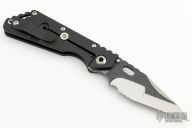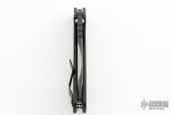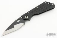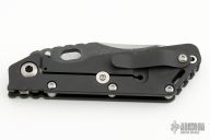 This Mick Strider Performance Series SMF framelock folder features a textured wharncliffe black blade with partial serrations, thumbhole and notched thumbrest. The handle has a black titanium frame with titanium clip, tip up carry. Jimping on blade spine. Includes Hinderer "Lock Bar Stabilizer" for maximum reverse lock retention. Nice detent, lockup and blade seating. Signed M. Strider in the finger choil. New from maker!