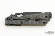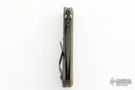This SNG by Strider Knives features a black blade with notched thumbrest and thumbhole. The handle has a Frag pattern green G-10 and flamed titanium frame with matching tip up clip. Nice detent, lockup and blade seating. Excellent condition.