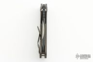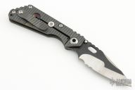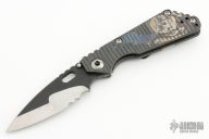 This MSC SNG framelock folder features a nightmare ground partially serrated textured blade with thumbhole and notched thumbrest. The handle has a flamed titanium frame with matching tip up clip . Jimping on blade spine. Nice lockup, detent and blade seating. Comes with zipper case. Excellent condition.