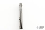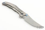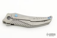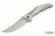 This Persian Integral by Peter Rassenti features a stonewash finished blade with notched thumbrest, dual anodized thumbstuds and flipper. The handle a bead blasted integral titanium frame with anodized pivot collar, titanium pocket clip is positioned for right hand, tip up carry. Includes a zippered case. New from maker at the 2023 Blade Show.