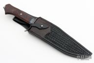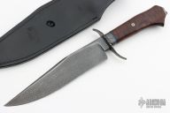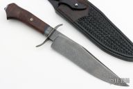 This Take Down Fighter named Midnight Special by Journeyman Smith Kelly Vermeer Vella features a "Riptide" pattern Damascus blade with a sharpened top edge, .248" blade stock and 1.750" blade depth, hidden tang construction. The handle has a Damascus guard, the spacers are fileworked and blued steel and Damascus, beautiful ringed gidgee wood grip with mosaic pins and a Damascus butt with blued steel tang nut. Comes with a hand tooled black leather sheath with ostrich leg skin overlay by Paul Long, and a zippered case. New from maker at the 2023 Blade Show Texas. Comes with COA.